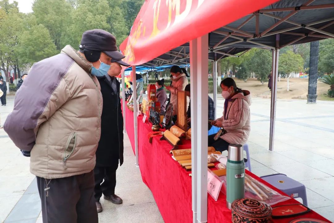 打卡带货漆器、雕刻、刺绣、皮影戏……非遗成果展牌进行宣传展示,吸引市民驻足观看。