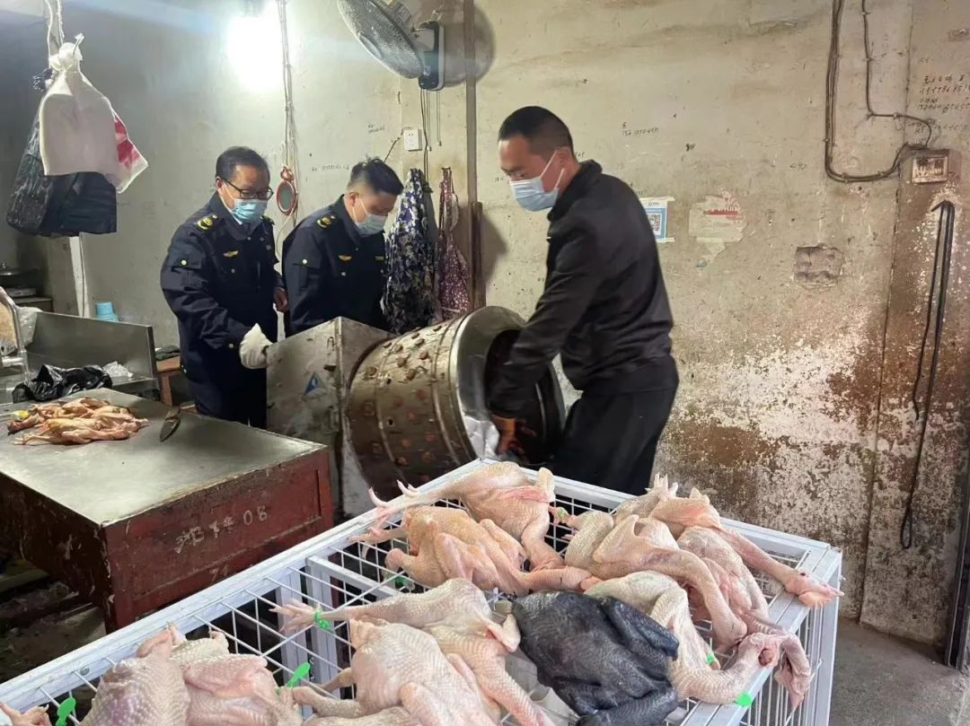 “你好老板,麻烦配合下我们的工作,现在中心城区禁止活禽交易和屠宰,你们的脱毛机不能在店使用了……”3月15日清晨,东城街道联合区农业农村局、东城综合执法中心、东城市场监管所、东城农服中心、东城派出所及东兴社区,对香江市场内4处活禽交易点进行联合执法行动。