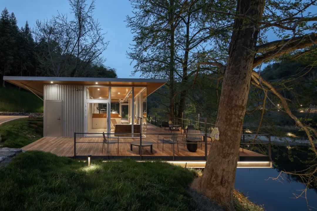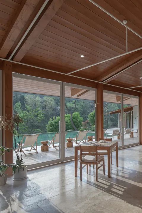 一个倒映着树影的无边界泳池,就在景观餐厅的外面。而一旁则是带框景的休息廊。初夏的夜晚,在泳池旁喝一杯小酒,看着森林如何将自己藏进黑夜里。看落日余晖如何透过二楼走道的跳窗,在泳池旁踱步。