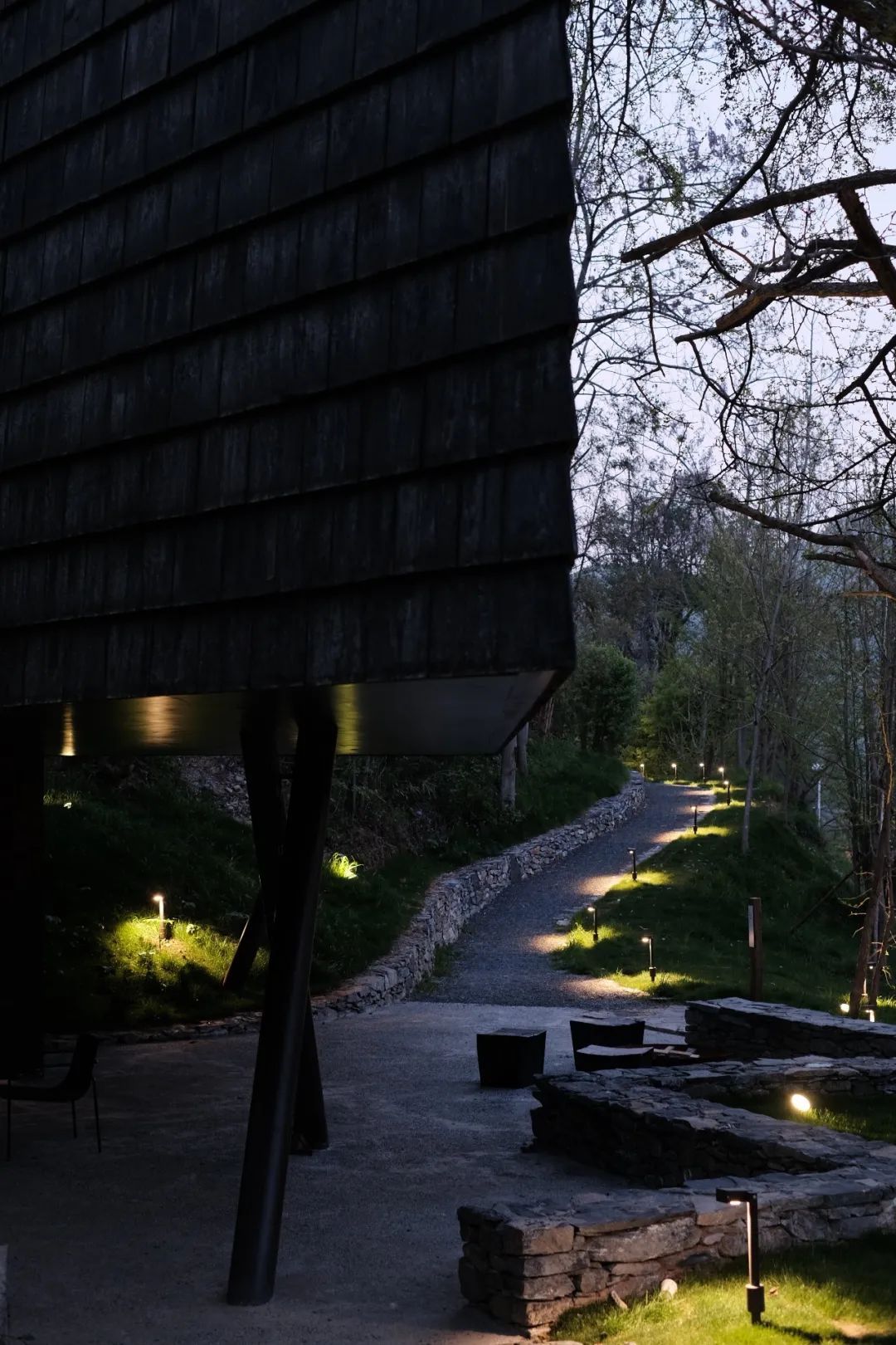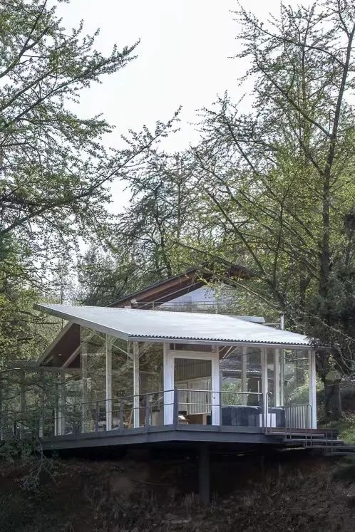 这里曾经是一个柴火房,如今设计师把它改成了更适合孩子们的黑色树屋。高高架起的建筑 ,离树更近,踏上几步台阶,登上观银杏树的平台,转身,透过舷窗,就是我们藏在树下的小屋。