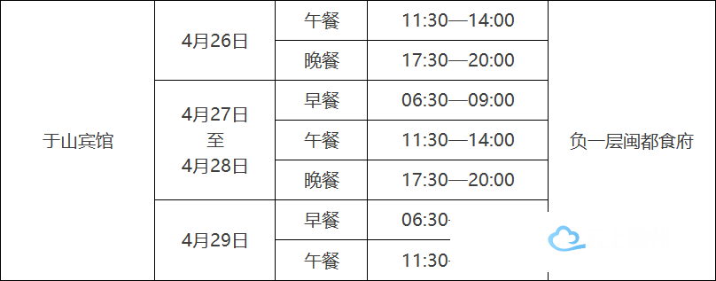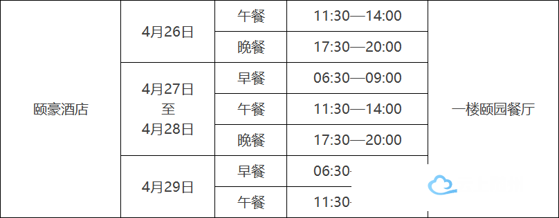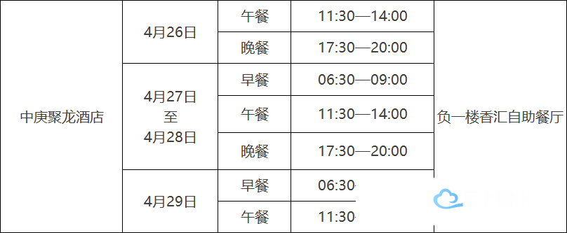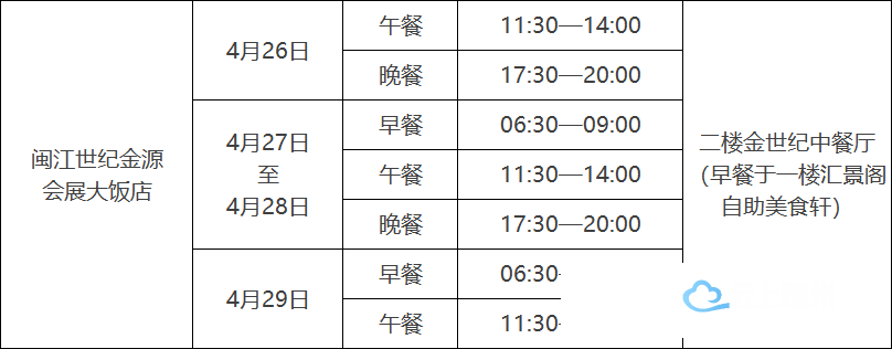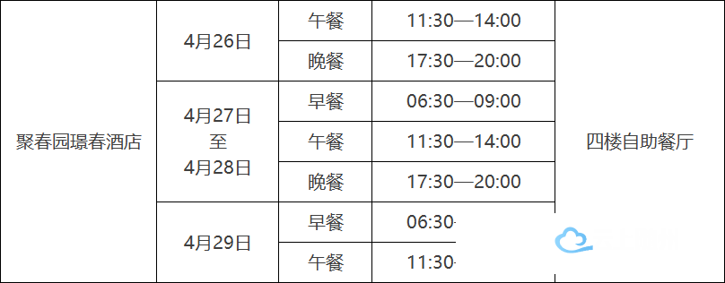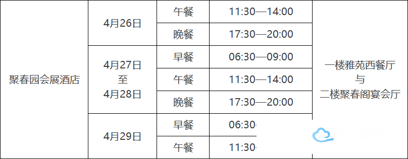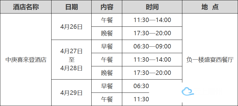 峰会将在各下榻酒店为参会嘉宾提供工作餐,形式为自助。请凭峰会证件/餐券入场就餐。具体信息详见以下用餐安排表: