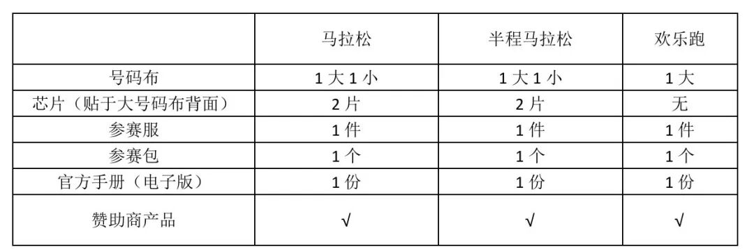 马拉松、半程马拉松选手每人两块号码布,一块大号码布(含芯片)和一块小号码布(存衣用);