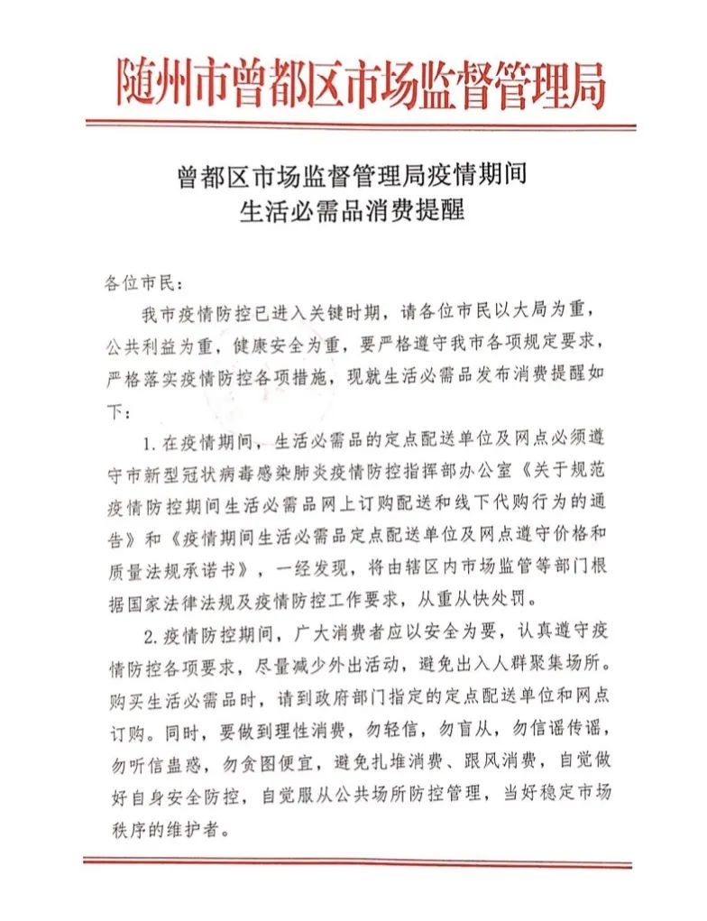 2.疫情防控期间,广大消费者应以安全为要,认真遵守疫情防控各项要求,尽量减少外出活动,避免出入人群聚集场所。购买生活必需品时,请到政府部门指定的定点配送单位和网点订购。同时,要做到理性消费,勿轻信,勿盲从,勿信谣传谣,勿听信蛊惑,勿贪图便宜,避免扎堆消费、跟风消费,自觉做好自身安全防控,自觉服从公共场所防控管理,当好稳定市场秩序的维护者。