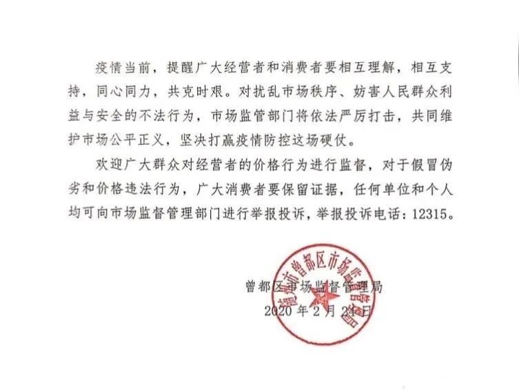 疫情当前,提醒广大经营者和消费者要相互理解,相互支持,同心同力,共克时艰。对扰乱市场秩序、妨害人民群众利益与安全的不法行为,市场监管部门将依法严厉打击,共同维护市场公平正义,坚决打赢疫情防控这场硬仗。