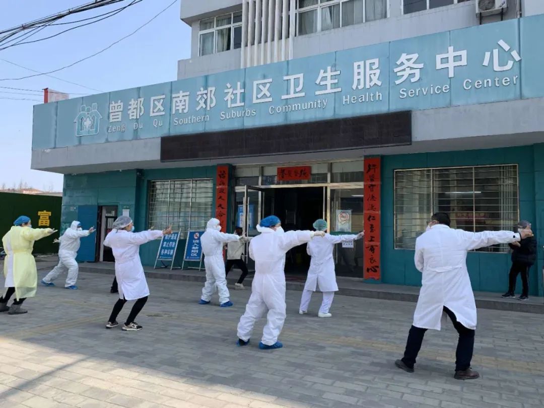 “两脚分开与肩同宽,微微下蹲,双手抱在腹前,深呼吸几次……”3月12日下午,在南郊卫生院大门前广场和柳树淌院区大厅内,随着一段舒缓的音乐,医护人员和患者拉开距离,中医康复科医生带领大家练习八段锦养生操。