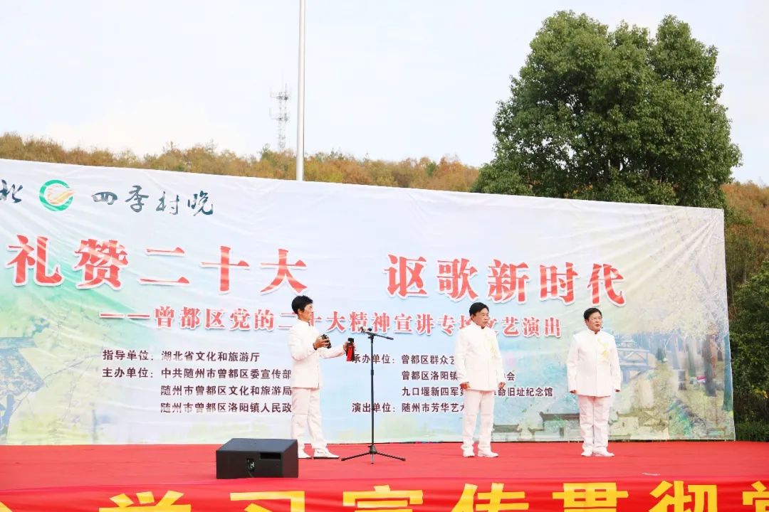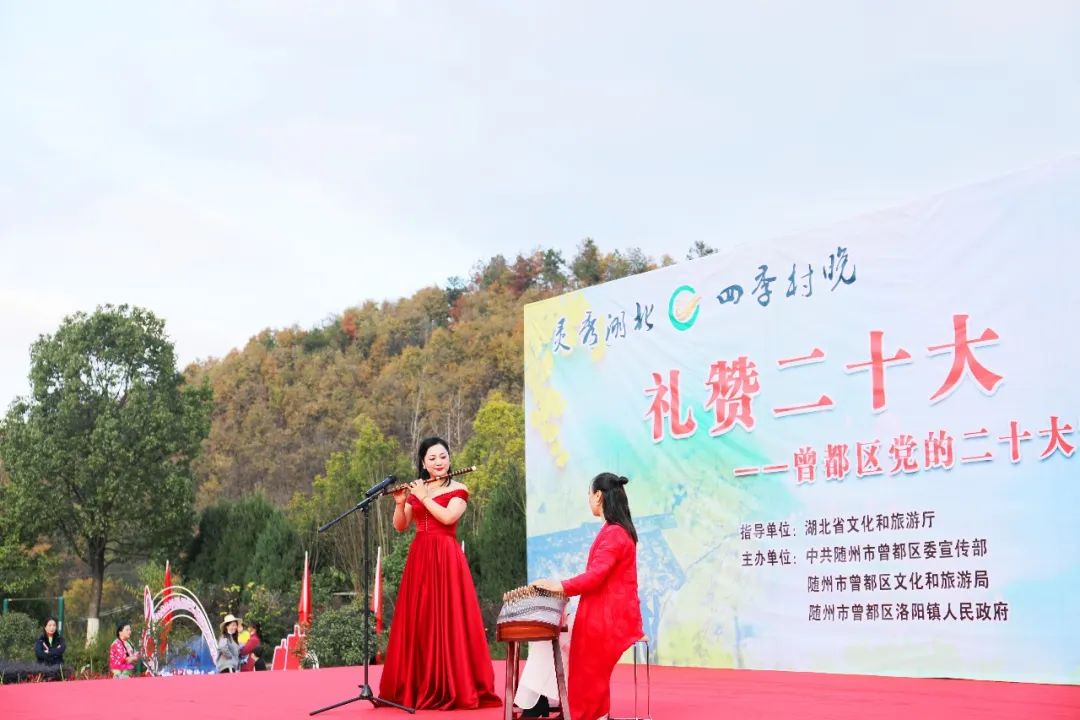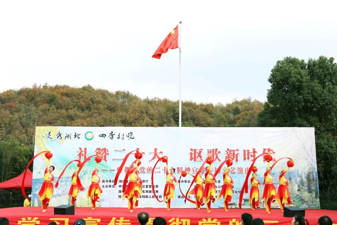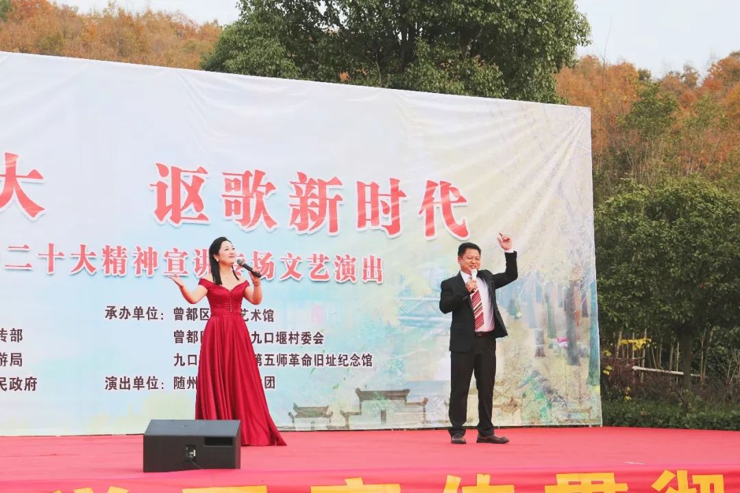 演出由舞蹈《欢歌新时代》拉开序幕,紧接着,器乐演奏《风筝误》、女声小合唱《十送红军》、舞蹈《母亲》、小品《过河》、男声独唱《永远跟党走》、快板舞《喜庆二十大 奋进新征程》、男声小合唱《游击队之歌》、《弹起我心爱的土琵琶》、豫剧表演唱《咱们说说知心话》、随州慢板《喜庆二十大》、情景舞蹈《沂蒙情》、黄梅戏《对花》、大型戏剧串烧《梅花赋》、《梨花颂》、《红梅赞》等精彩节目轮番上演,铿锵有力、清脆悦耳的快板声,优美、大气的舞蹈,乡土气息浓郁的名俗表演引得现场观众阵阵掌声,整场文艺演出在观众们的欢声笑语中完美落幕。