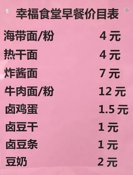 在收银台看到,海带面/粉4元,热干面4元,炸酱面7元,牛肉面/粉12元……品种丰富,明码标价,价格低于市场价,大家有说有笑自觉排队买早餐。