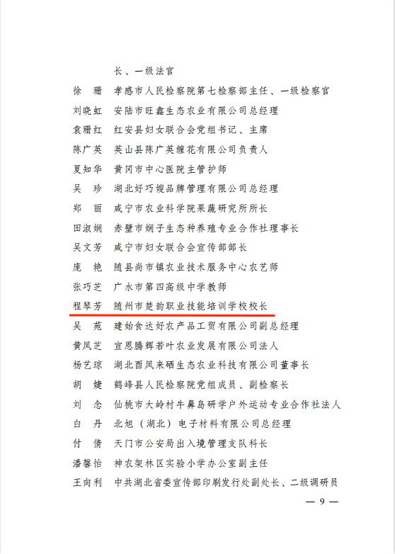 程琴芳,女,1970年10月出生,随州市楚韵职业技能培训学校校长。她多年来热心妇女儿童社会公益,积极参与各项捐赠和志愿服务活动。在全市率先开展“进社区、到乡村”送培训活动,帮助近2万名妇女掌握一技之长,并为学员们建立了共享服务平台,学员考试、颁证、就业一条龙服务。她积极助力精准扶贫,带领全体职工先后到余店镇杨岭村、三里岗镇伏岭村、陈巷镇方略村、西城街道玉波门社区开展对口帮扶,帮助5名贫困户顺利脱贫。先后被评为湖北省“儒商精英”和随州市妇联系统先进个人。