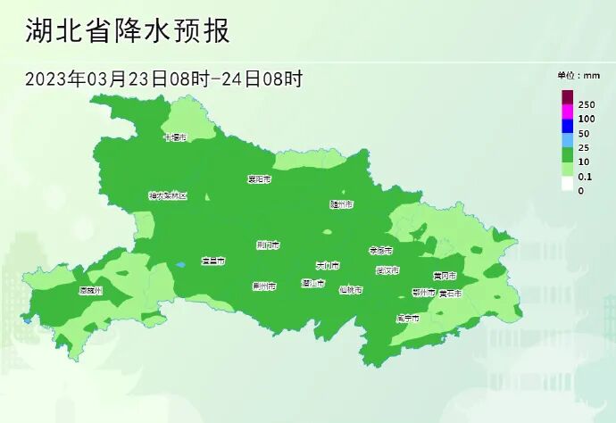23晚上到24日白天:全省阴天有小雨,鄂东南局部有中雨。