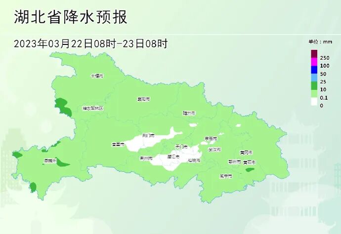 22日晚上到23日白天:江汉平原北部、鄂东北阴天有小雨;其他地区阴天有小到中雨。