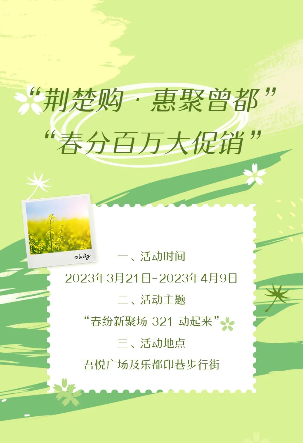 3月24日,“荆楚购·惠聚曾都”吾悦广场“春分百万大促销”启动仪式在吾悦广场举行。区商务局联合吾悦广场开展形式多样、丰富多彩的打折促销活动,为全区人民送上一场精彩纷呈的消费盛宴。