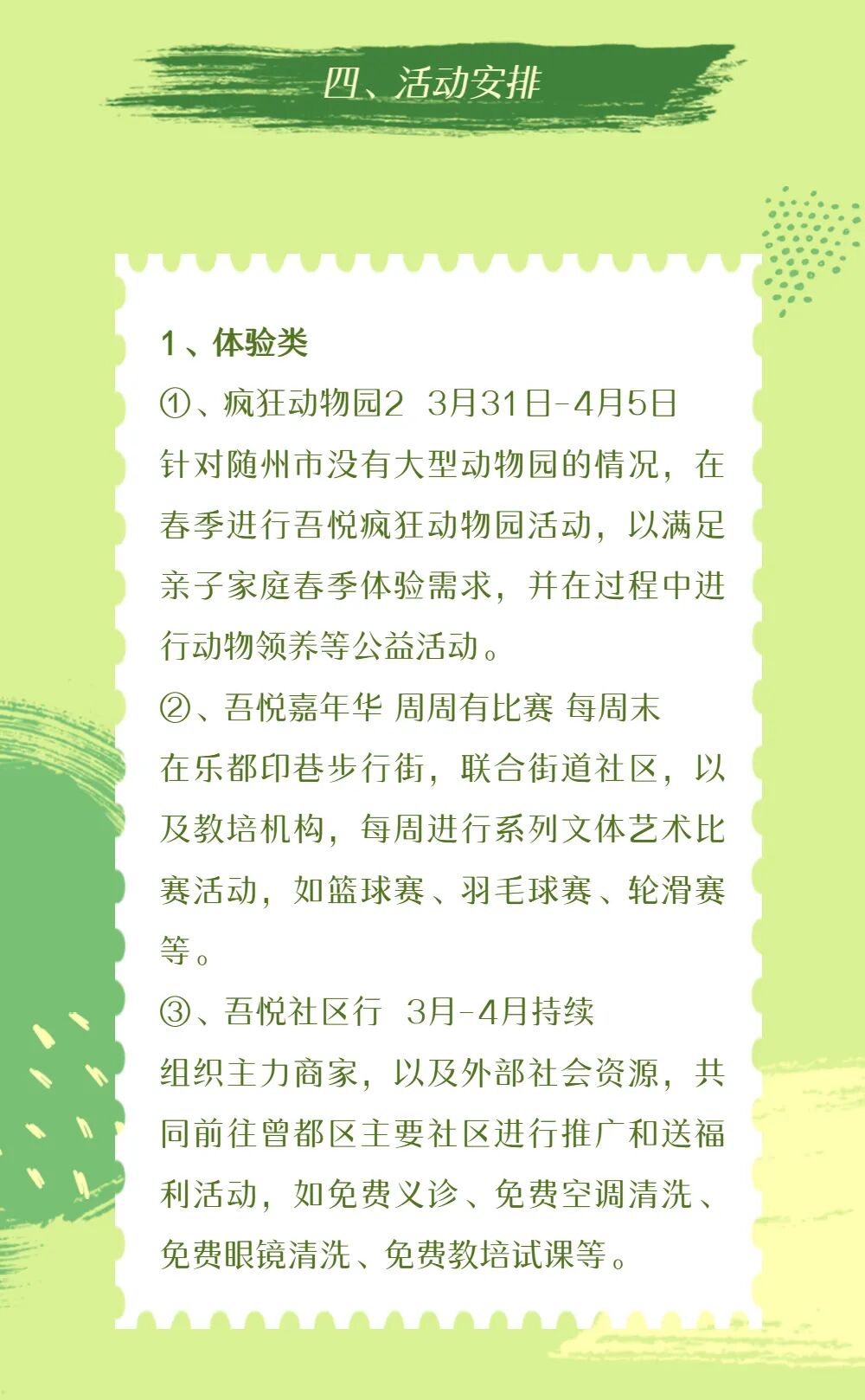 据了解,吾悦广场积极响应政府“荆楚购”活动,在3至4月开展“321 春纷新聚场”主题活动。活动中,吾悦广场将整合商家资源推出重磅促销活动,还将带着主力商家“走出门去”,到小区楼下,把活动和福利送到市民“家门口”。还推出“疯狂动物园第二季”,为亲子家庭带来萌宠科普和互动体验;组织系列邻里运动赛事,提倡健康生活。