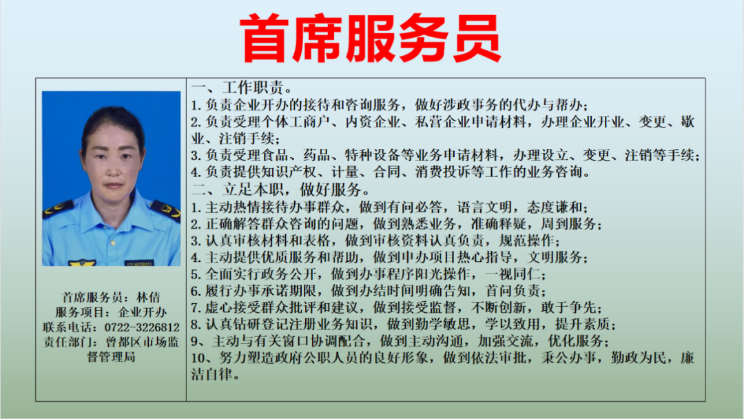 为促进曾都区营商环境在开办企业环节更加优化,让企业准入更方便、更快捷、更高效,强力助推市场主体发展,区市场监督管理局从今年1月1日起开始在登记注册业务中试行“首席服务员”模式,制定了《关于在开办企业环节试行“首席服务员”制度的实施办法》和《开办企业环节试行“首席服务员”制度办理流程图》。“首席服务员”制度是指在开办企业环节将登记注册受理人员与审批人员职责合并,登记注册的受理、审查、核准以及发照、归档等各个小环节均由具有审批资格的同一人员(以下简称“首席服务员”)负责完成,对申请人提交的登记注册事项实行“审核合一、一人通办、全程服务”,实行一人独立审查核准制,依法作出登记注册决定。
