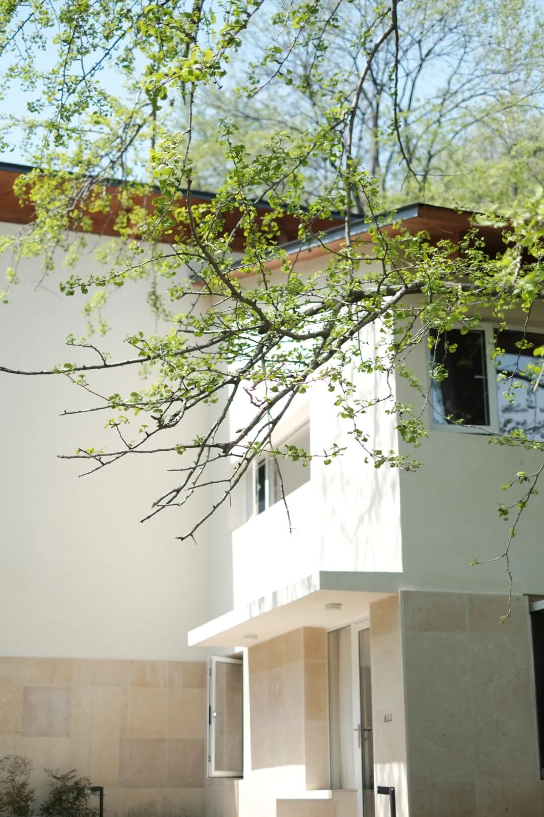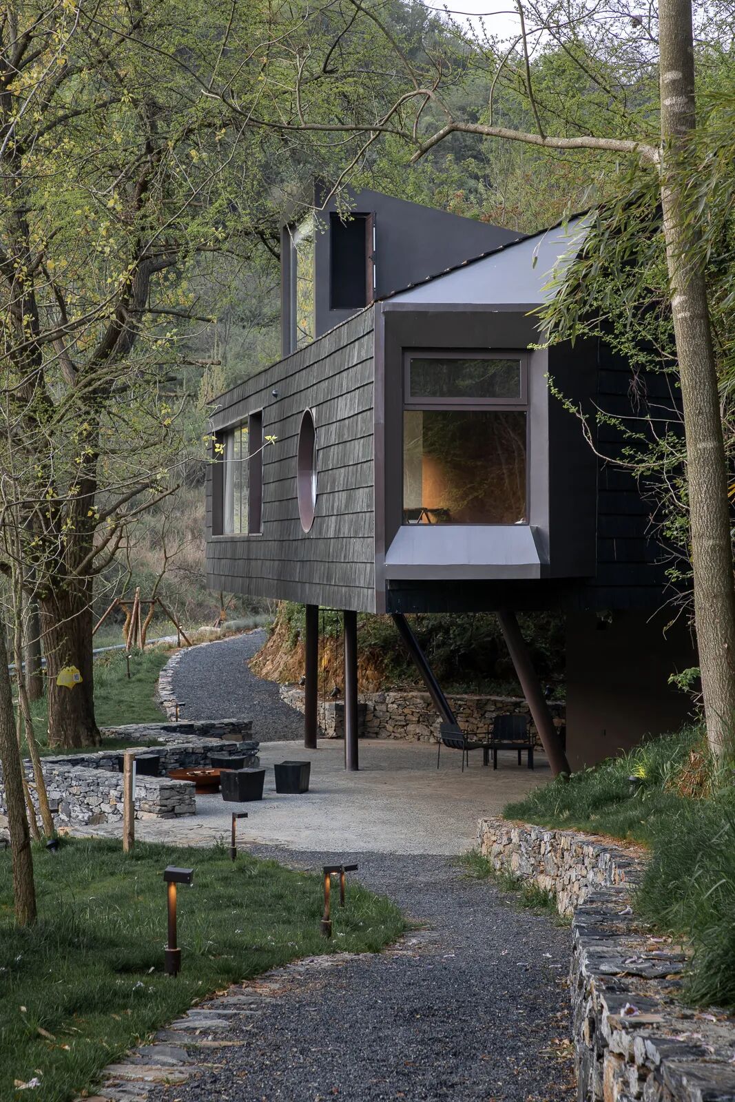 这里曾经是一个柴火房,如今设计师把它改成了更适合孩子们的黑色树屋。高高架起的建筑 ,离树更近,踏上几步台阶,登上观银杏树的平台,转身,透过舷窗,就是我们藏在树下的小屋。