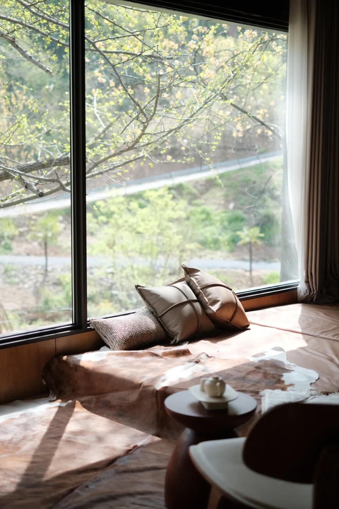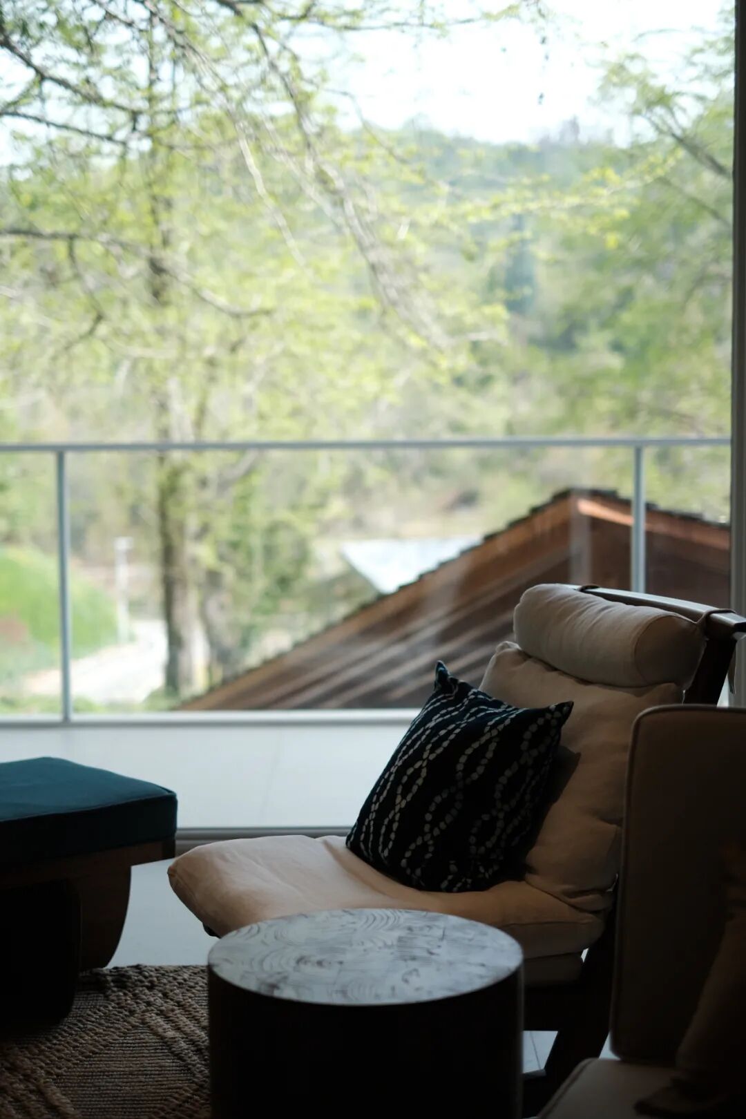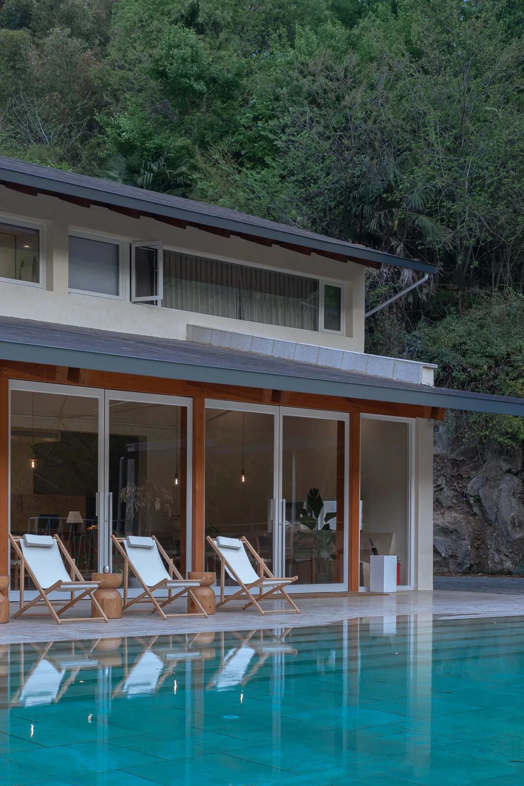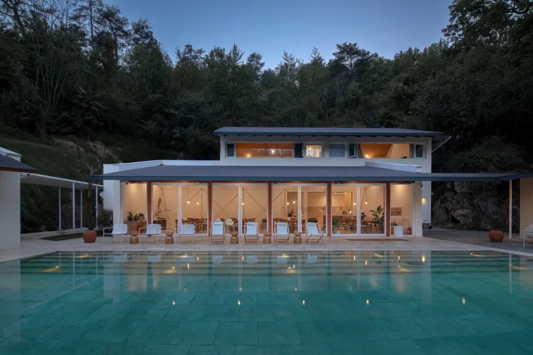 一个倒映着树影的无边界泳池,就在景观餐厅的外面。而一旁则是带框景的休息廊。初夏的夜晚,在泳池旁喝一杯小酒,看着森林如何将自己藏进黑夜里。看落日余晖如何透过二楼走道的跳窗,在泳池旁踱步。