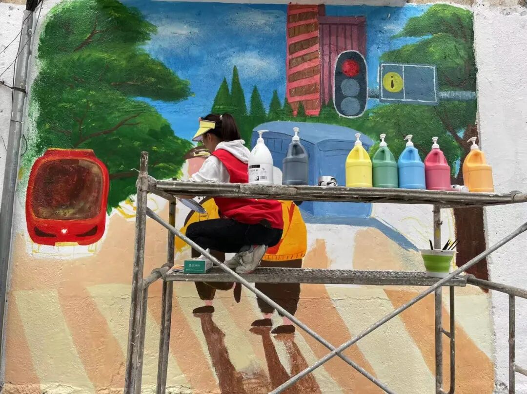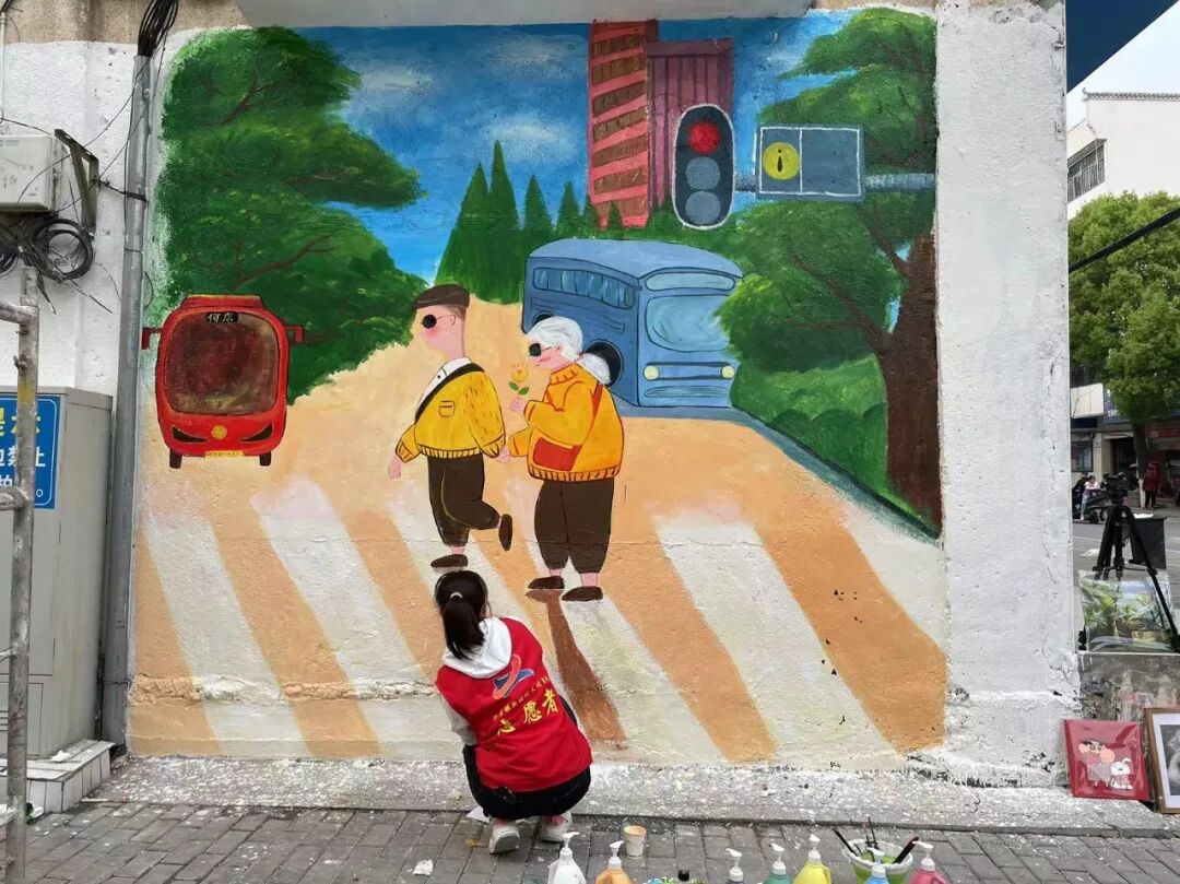 96年的姑娘杨思宇,家住何店镇响堂街社区,是一名美术老师。看到大家绘墙画时,主动上前询问,需不需要帮忙,可以加入志愿者队伍一起画。于是,大家又挑选了何店镇区十字路口的一面墙,商量着画一幅“文明出行”的墙绘。