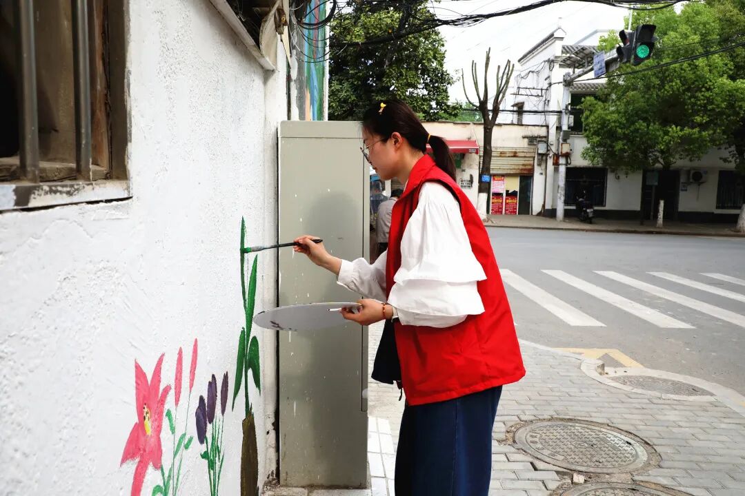 在墙体彩绘之前,社区工作人员变身粉刷匠,刷白了墙体。志愿者杨思宇从早画到晚,机关干部中午抽时间来画。放学时间,一位小学生贝贝(化名)路过,主动推荐自己,“我想画一朵花,为美化家园出一份力。”
