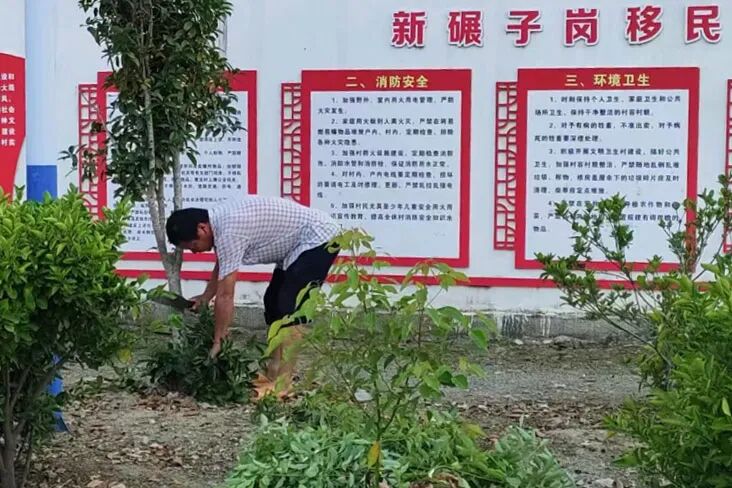 九组村民何方平在修整房前树木