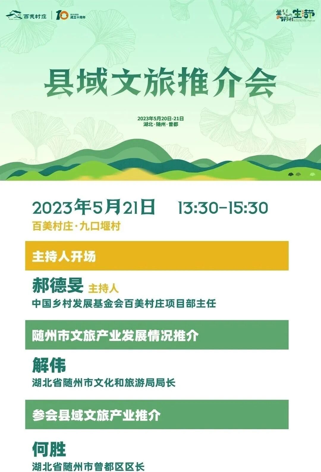 5月21日下午,由中国乡村发展基金会和曾都区人民政府共同举办县域文旅推介会在曾都区洛阳镇九口堰村“大乐之野”举行。