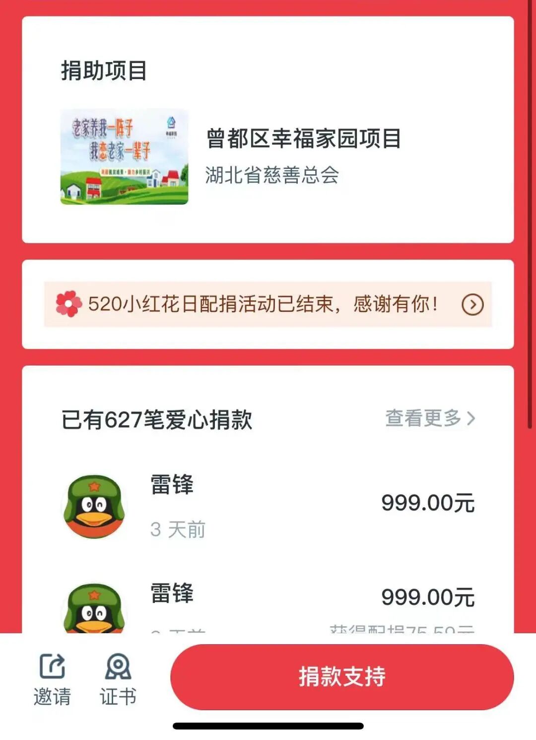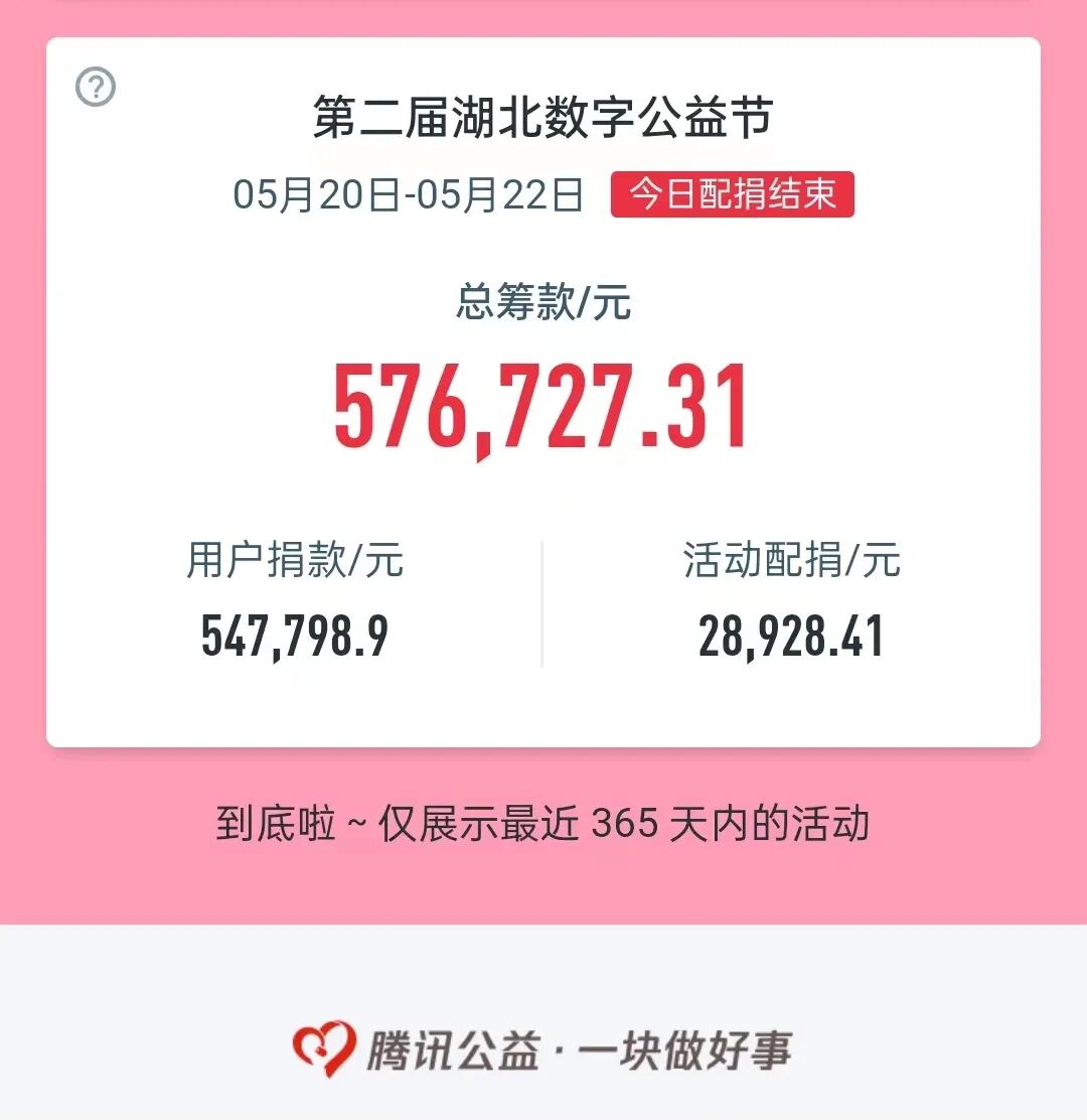 5月20日至5月22日,2023年“乡村振兴·湖北专场”暨第二届“湖北数字公益节”圆满收官。曾都区慈善总会第一时间投入到省联动项目中,共筹集善款576727.31元,其中,公众捐款547798.9元,腾讯公益慈善基金会配捐28928.41元。