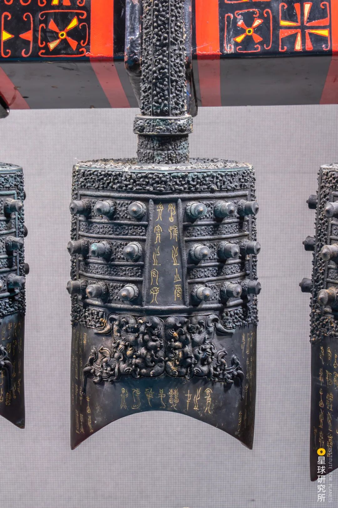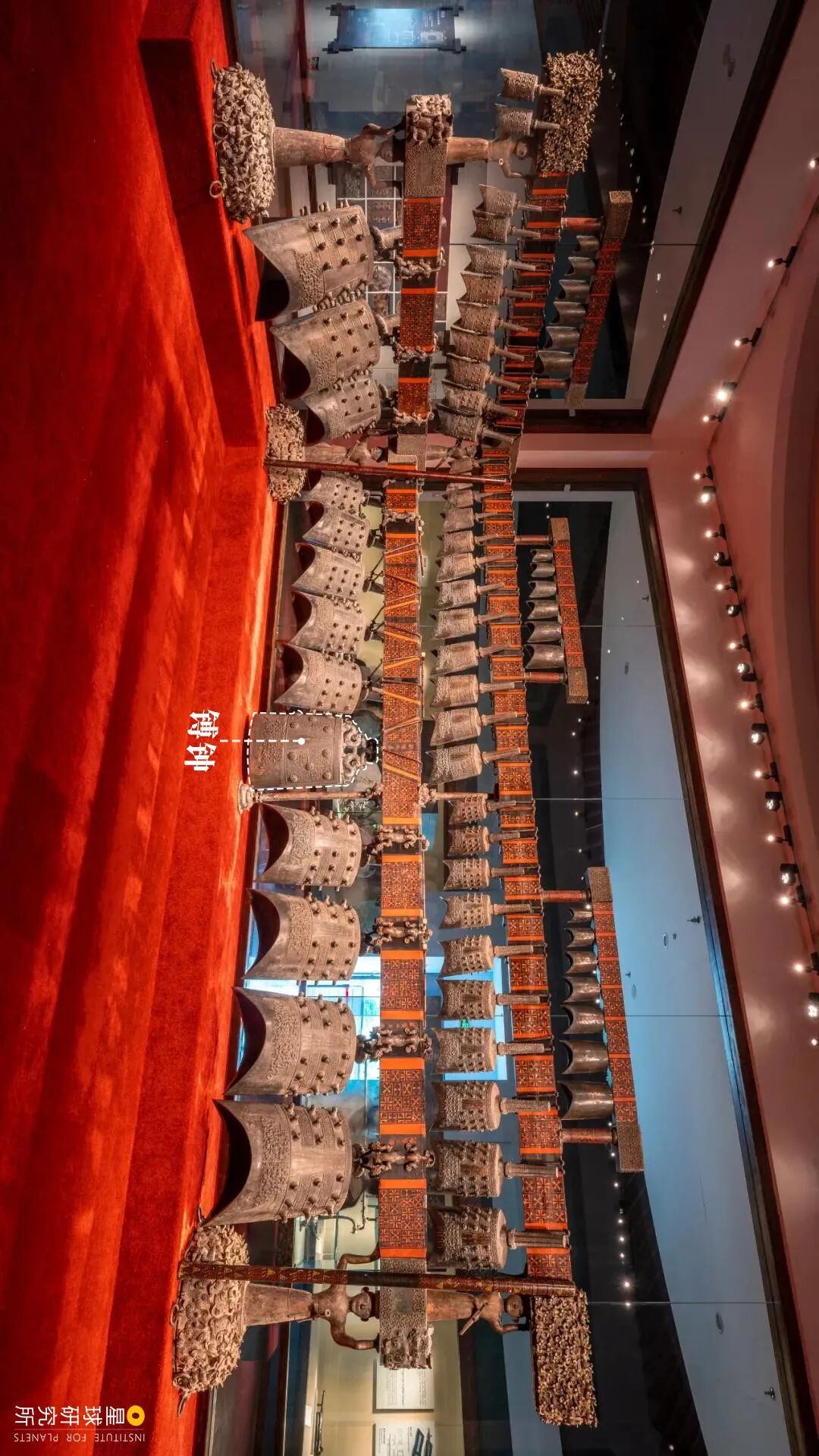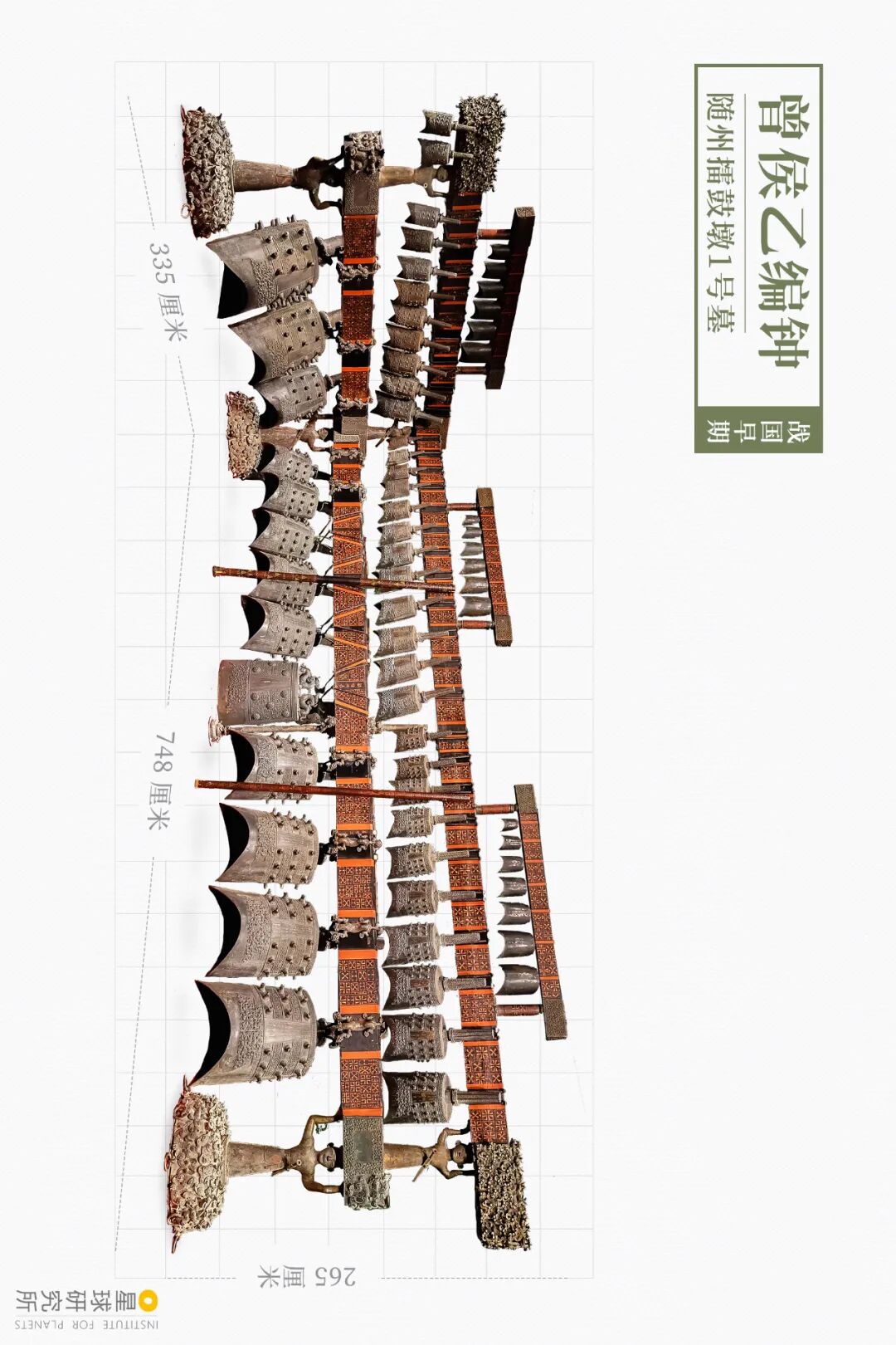 特别是1978年出土于随州的曾侯乙编钟65件,至今仍是中国出土数量最多、重量最重、音律最全、气势最为宏伟的一套编钟。其巍峨、完美的“曲悬”架式,与配套的曾侯乙编磬,完整、明确地呈现了周代诸侯的“轩悬”制度,并与其他青铜礼器一起交织出一幅近于现实的礼乐场景。