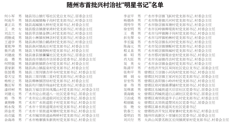 乡村振兴,关键在人,关键在干,关键要有一个好“头雁”。党建引领乡村治理促乡村振兴工作中,全市涌现出一批政治坚定、对党忠诚,带富能力强、服务群众意识强的村(社区)党组织书记。为鼓励先进、选树典型,更好发挥优秀村(社区)党组织书记示范引领作用,全面推行导师帮带制,锻造坚强有力的“头雁方阵”,经各地党委考核推荐、相关部门联审、市委组织部复核,认定了市级首批兴村治社“明星书记”。现将50名市级兴村治社“明星书记”予以公示,如对拟认定对象有异议的,请向中共随州市委组织部反映。