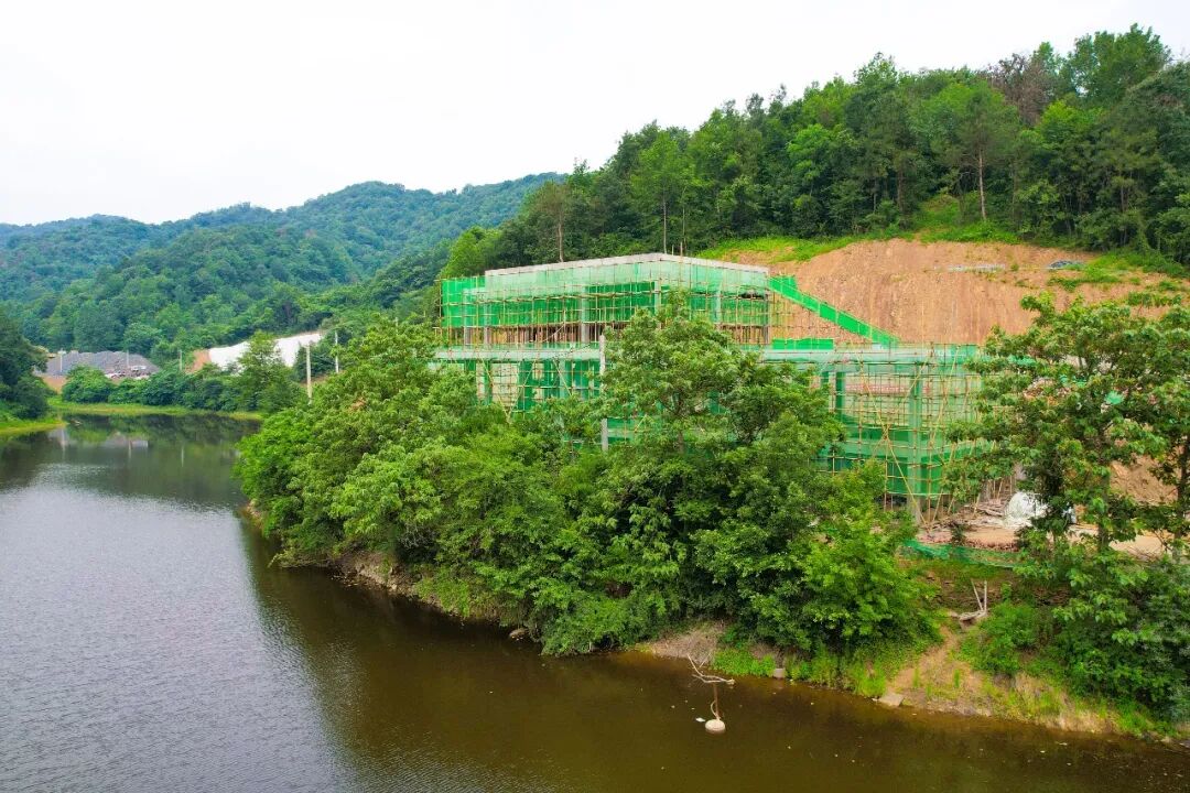 6月15日上午9点左右,骄阳似火,热浪袭人。穿过蜿蜒的乡间小道,来到大山深处的洛阳镇小岭冲村阙家冲,“裸心隐”民宿项目施工现场一片火热,水库旁一栋建筑主体工程接近完工,工人们正在用大型机械向下一个项目现场转运建筑材料。