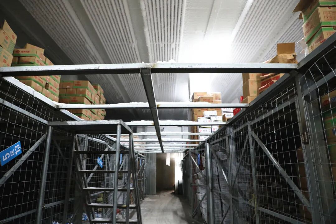 进入冷库后,明显感到寒气来袭。穿过两层门帘往里面走,冷库里货物摆放整齐,地面上已经结冰,墙壁、铁架上都是厚厚的冰碴,灯光下能看到一层雾气。