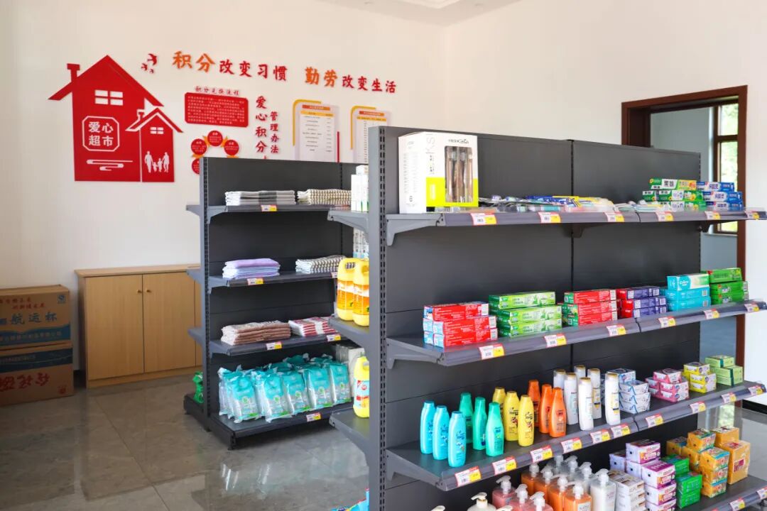 在邓家老塆村共同缔造展览馆爱心超市内,可以看到纸巾、洗衣液、笔记本等生活物品一应俱全,不同物品标注着不同的积分。村民们可以通过参与环境卫生清洁、村级事务管理、文明乡风创建等活动获得相应的积分。