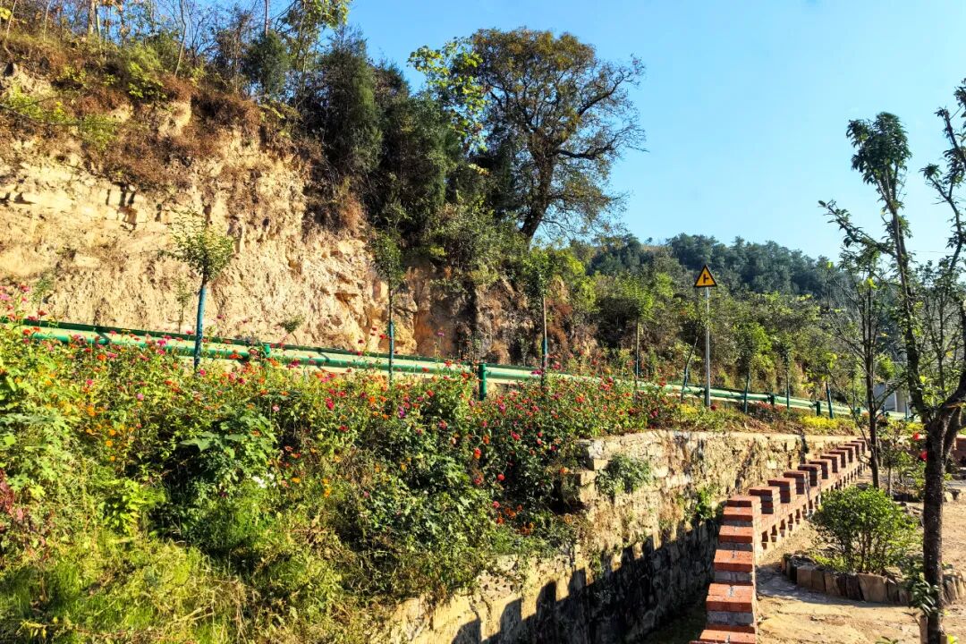 沿着蜿蜒的万岩公路继续行驶,公路旁绿树成荫,鲜花盛开,新中村候车亭旁,数十块石子垒起一个“拳头”造型的花坛,引得行人驻足打卡。