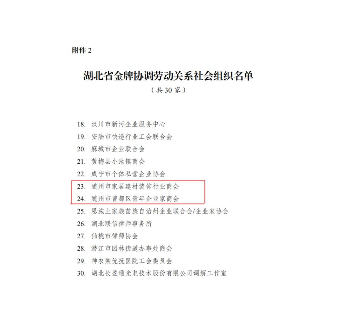 随州市家居建材装饰行业商会与曾都区青年企业家商会荣获湖北省金牌协调劳动关系社会组织。两个组织始终致力于促进劳动关系的和谐与稳定,通过提供法律咨询、调解服务、培训指导等方式,帮助全区多家企业和员工解决劳动纠纷,为我区劳动关系的和谐稳定作出了突出贡献。