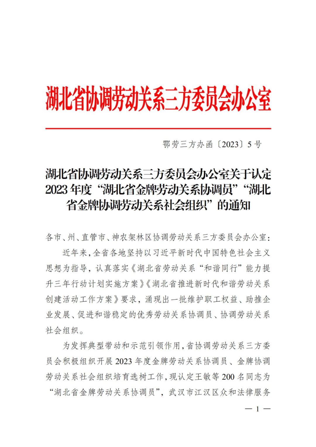 近日,湖北省协调劳动关系三方委员会办公室印发《关于认定2023 年度“湖北省金牌劳动关系协调员”“湖北省金牌协调劳动关系社会组织”的通知》,曾都区2名劳动关系协调员和2家协调劳动关系社会组织,在劳动关系协调领域取得了卓越的成绩,分别被认定为“湖北省金牌劳动关系协调员”“湖北省金牌协调劳动关系社会组织”。