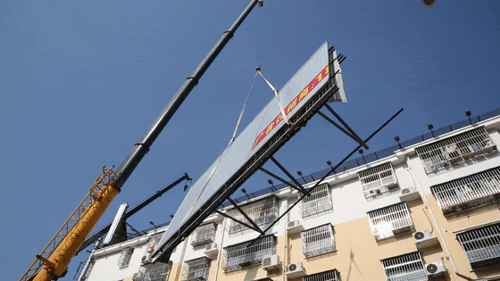 捆绑固定,切割分离,吊装落地,在专业人员的有序操作下,相邻两栋楼房顶层的两块巨型广告牌被分割成10块,依次拆卸落地。