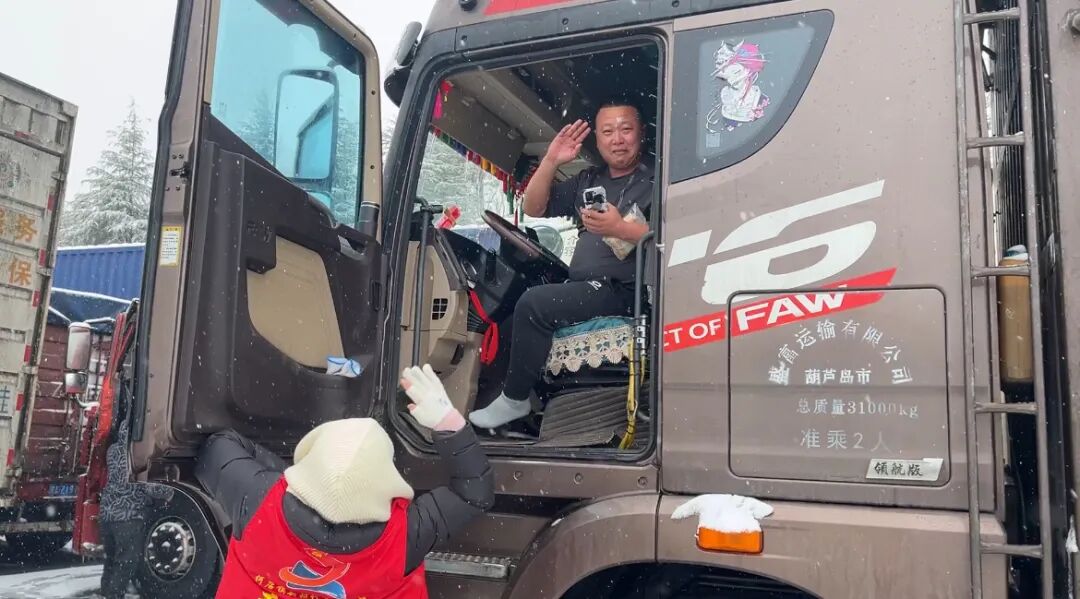 在现场,一批身着红色马甲的志愿者冒着风雪,顺着沿线车流,为滞留的人员送上物资。