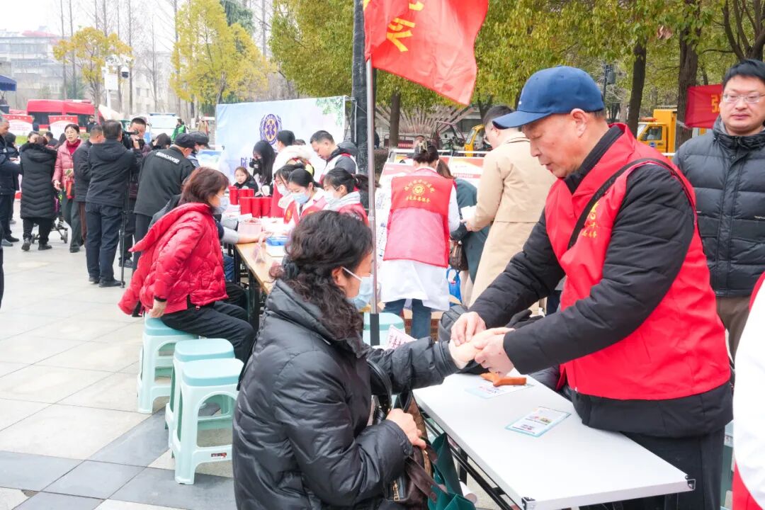 活动现场,通过宣传展板、发放传单、现场讲解、互动体验等形式向市民集中展示各单位2023年志愿服务成果。志愿者们身穿红马甲,结合本单位工作职能发放便民服务宣传单。