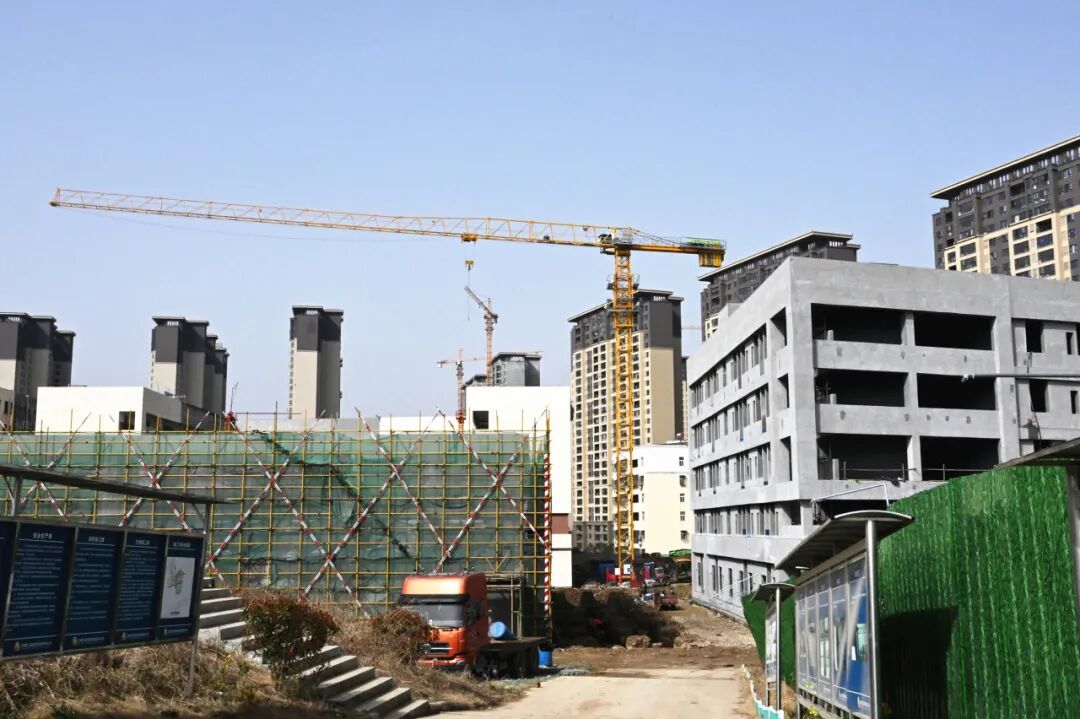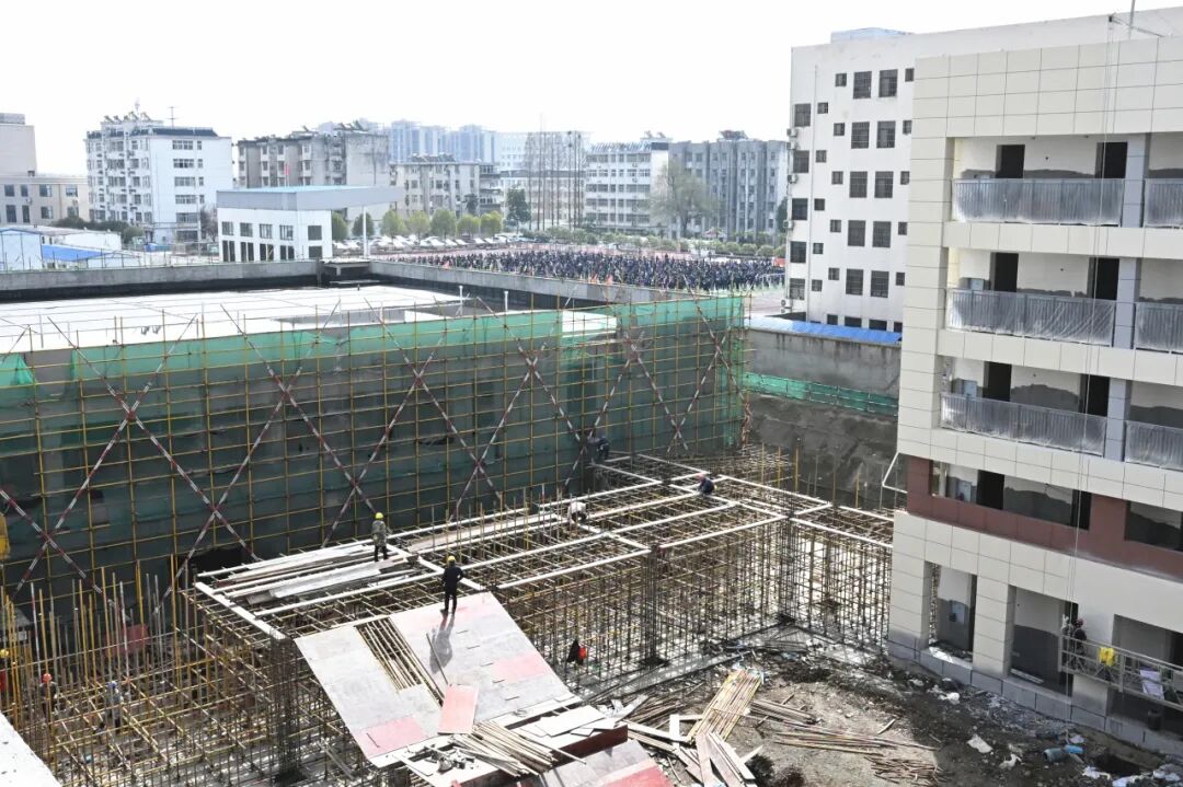 3月19日,走进曾都二中改扩建项目施工现场,两栋宿舍楼和食堂主体已经封顶,宿舍楼正在进行内外部装修施工,连廊、管网建设和绿化工作正在火热进行中。