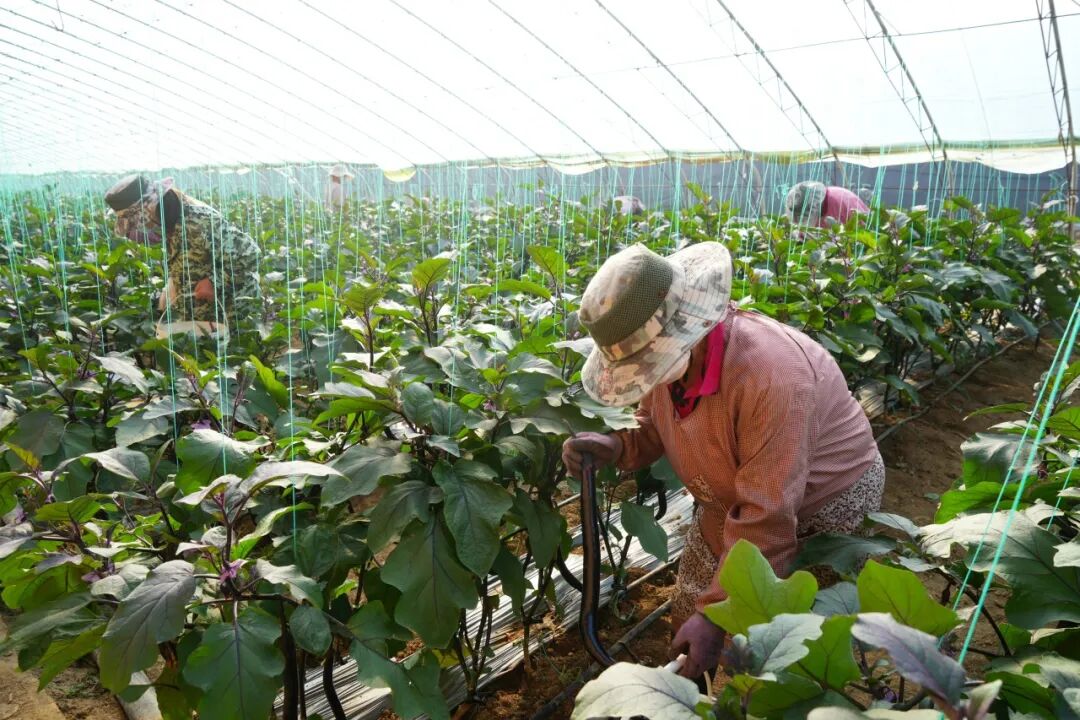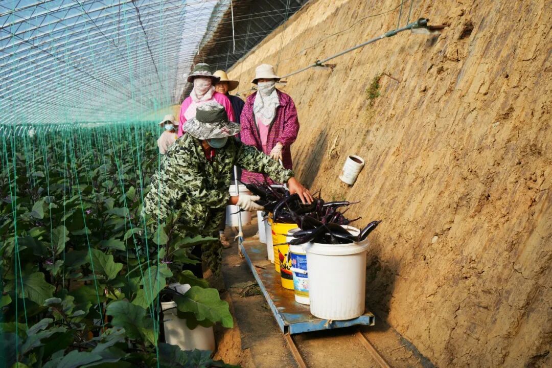 不一会儿,大家摘的茄子装满了一辆三轮车,司机开着车把茄子运到分拣装箱处。采摘好的茄子用塑料桶装着摆满场地,十几个工人按照有关标准挑选出残次品,把符合要求的茄子装入纸箱。“在这里打零工不用出远门,带了孙子,赚了钱,对我们这样的留守老人是个大好事。”62岁的万国华话语中透露着满意。