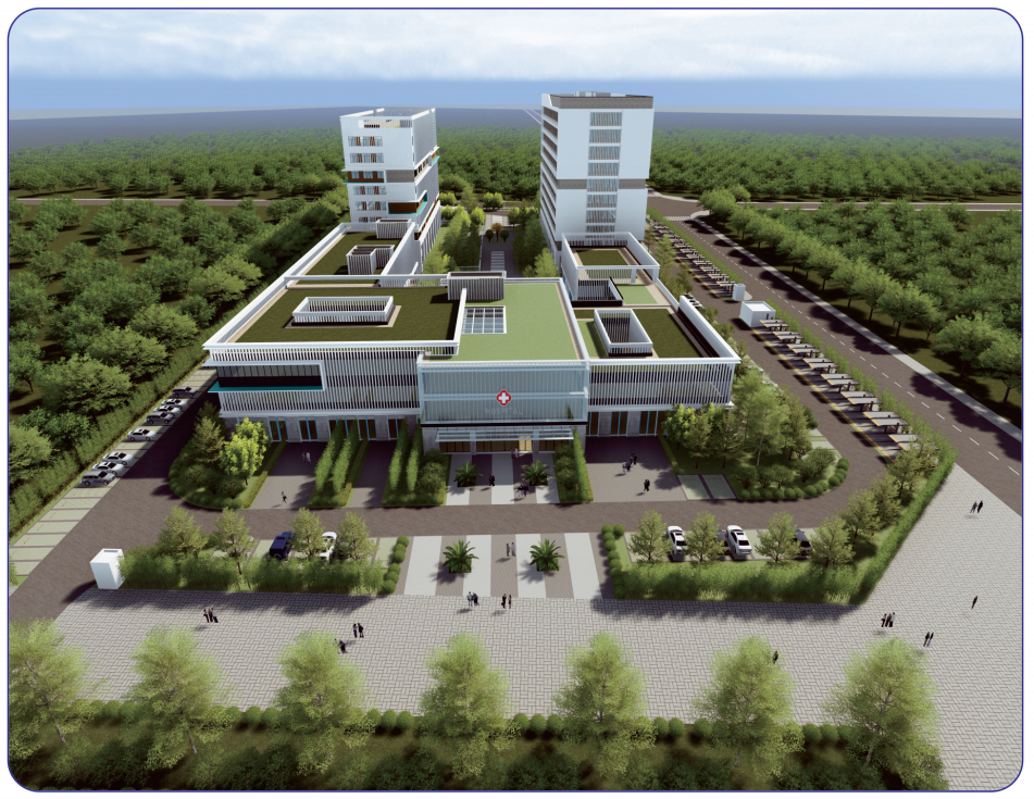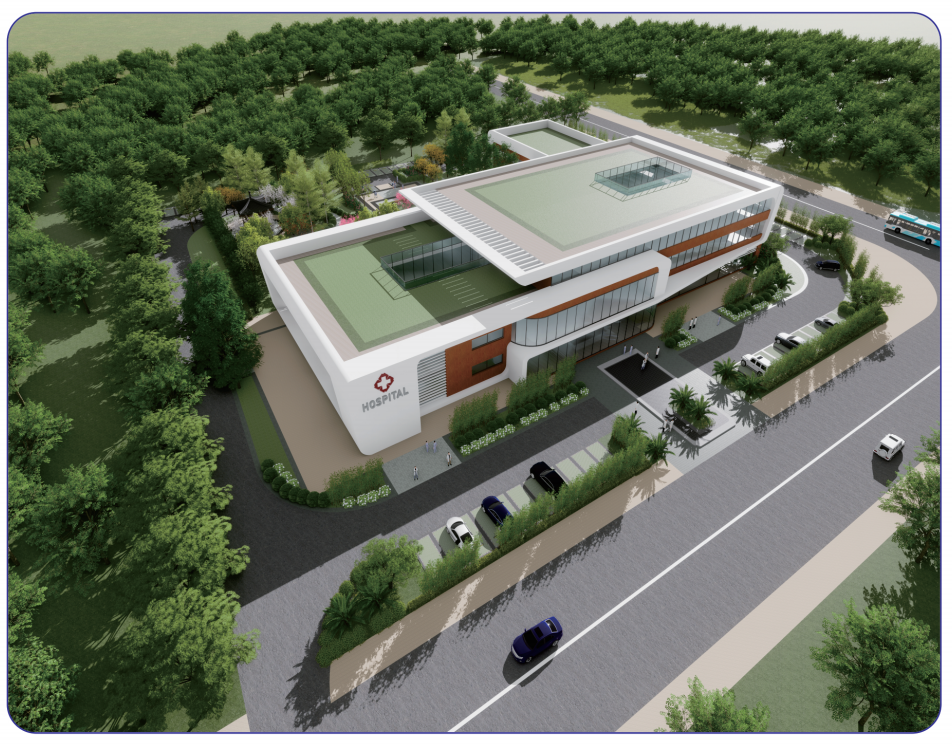 一期项目总建筑面积12369.11平方米,包含门诊大楼、住院部、食堂及行政办公楼。其中门诊大楼为3层,局部2层,建筑面积约7927.6平方米,住院部为2层,建筑面积约2325.38平方米,食堂及行政办公楼为2层,建筑面积约1606.44平方米。
