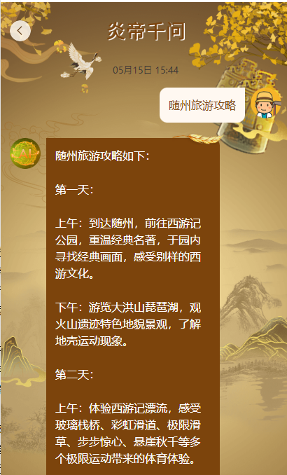 “炎帝千问”是依托百度文心一言与文新一格技术,打造的随州本地化AI 导游与政策向导,相当于一个“随州通”小管家。通过AI加持,用户可以通过“炎帝千问”,就随州市旅游攻略、相关创业扶持政策等内容与之进行互动。
