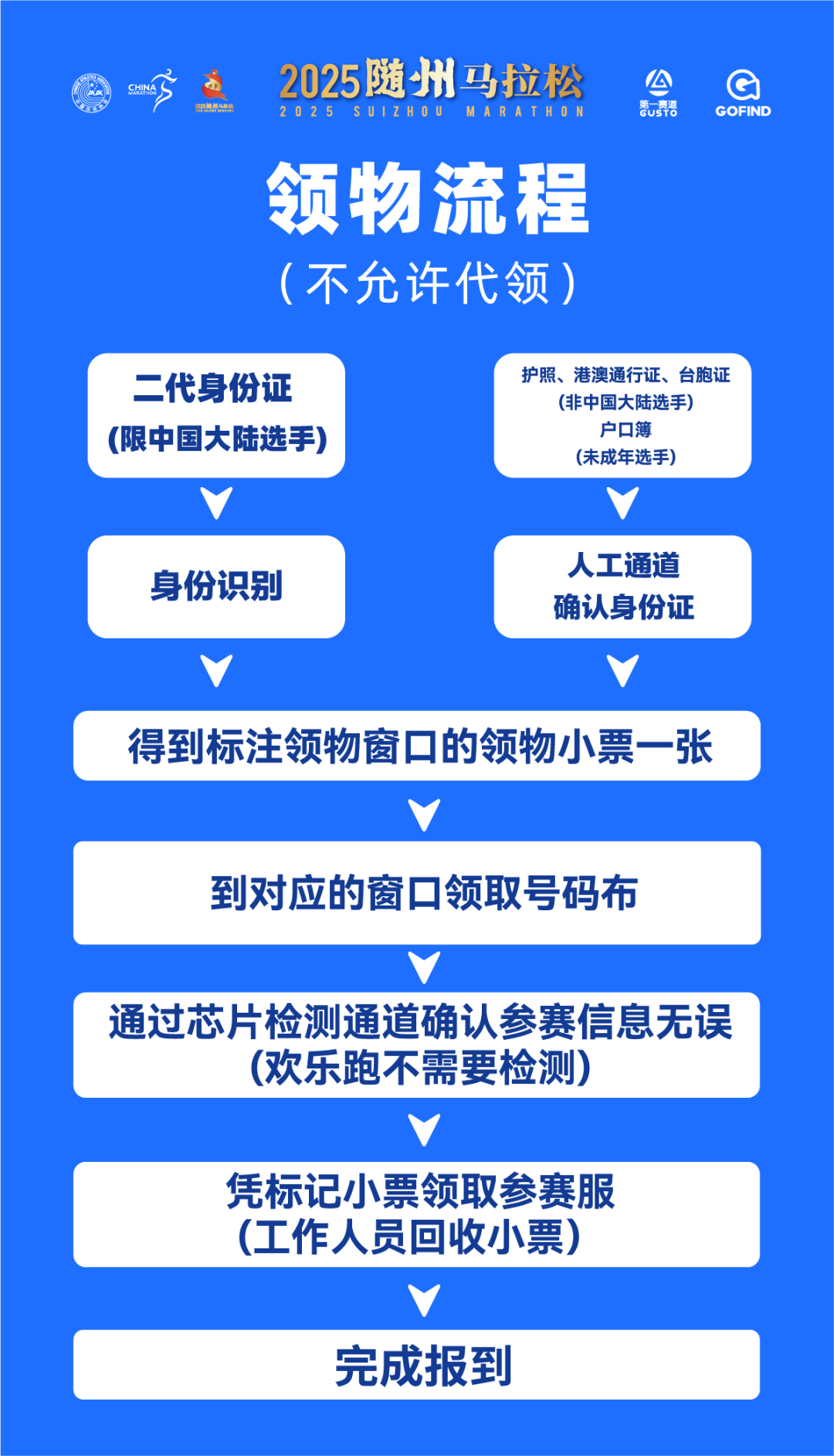选手须本人亲自到场领物,严禁代领,领取参赛物品时须携带:报名时所用的身份证件原件(二代身份证、护照、港澳通行证、台胞证等)。