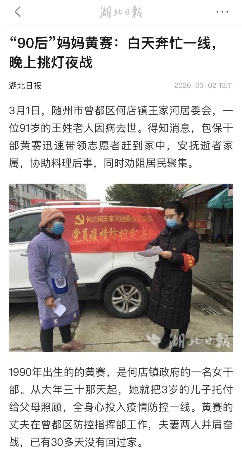1990年出生的的黄赛,是何店镇政府的一名女干部。从大年三十那天起,她就把3岁的儿子托付给父母照顾,全身心投入疫情防控一线。黄赛的丈夫在曾都区防控指挥部工作,夫妻两人并肩奋战,已有30多天没有回过家。