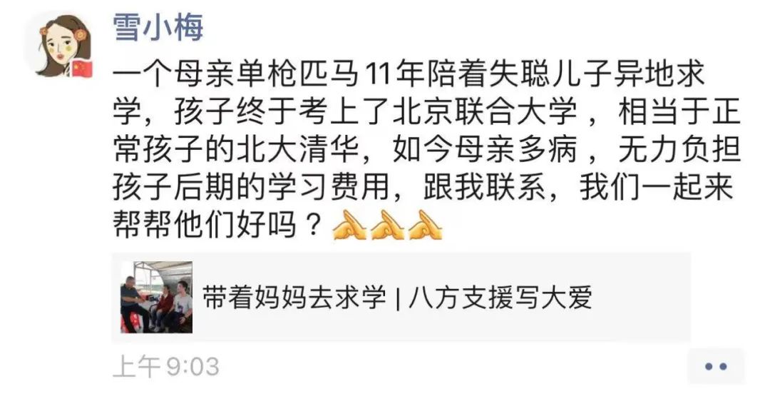 从机关单位到民营企业,从微信朋友圈到各群聊,马艳梅携子王志翔励志陪读的故事感动越来越多人,大家纷纷伸出援助之手。